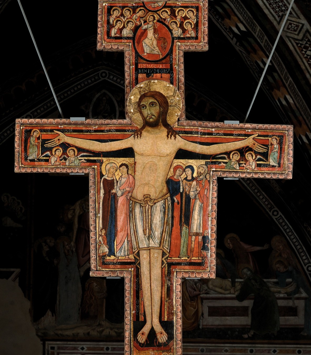 Das Kreuz von San Damiano ist als Ikone im 12. Jahrhundert von einem syrischen Mönch gemalt worden. Es zeigt Christus als den Auferstandenen und Verherrlichten. Durch dieses Kreuz wurde Franziskus angesprochen und in den Dienst der Kirche gerufen.